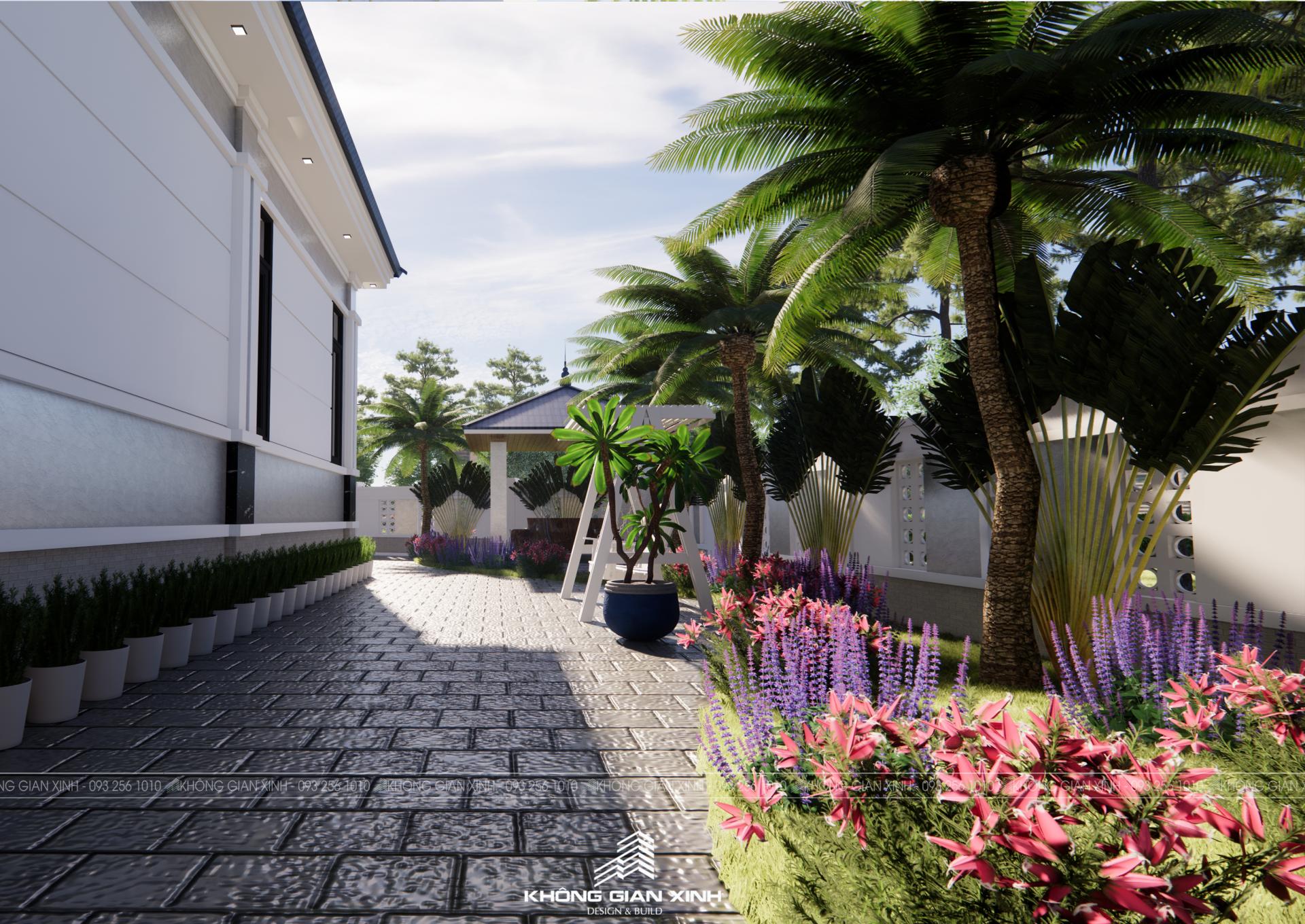 Phía trước là sảnh đón mở rộng, tạo cảm giác chào đón. Khu sân vườn nhỏ trồng cây xanh và hoa tươi quanh năm giúp ngôi nhà lúc nào cũng rợp bóng và tươi mát.