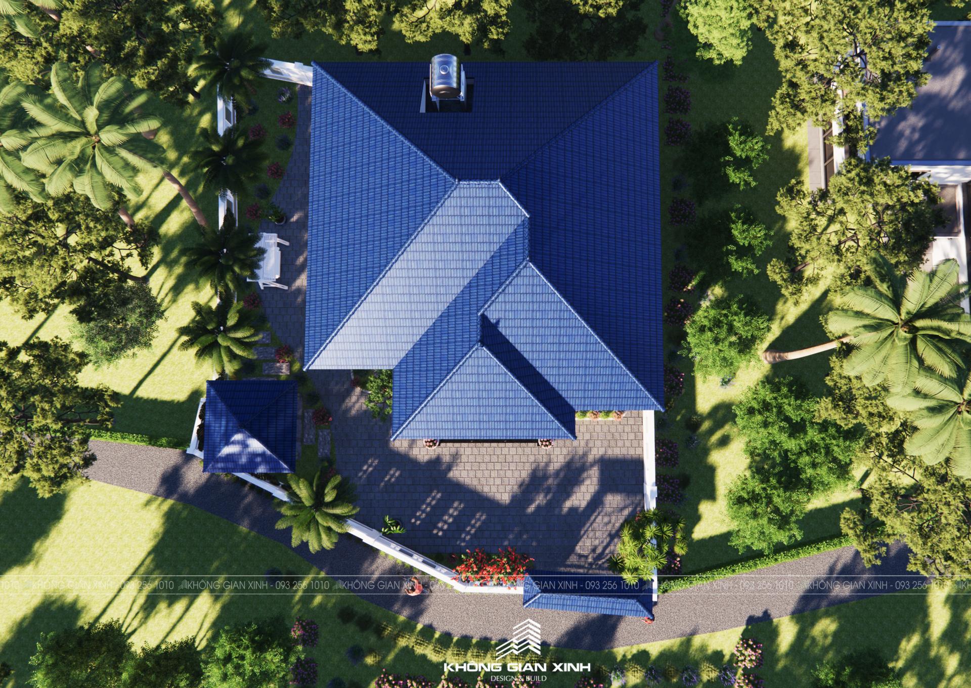 Ngôi nhà được thiết kế theo phong cách mái Nhật với phần mái dốc nhẹ, tỏa đều ra bốn hướng – giúp chống nóng, thoát nước mưa tốt và tạo cảm giác vững chãi, đầm ấm. Tường nhà sơn màu trung tính nhẹ nhàng, kết hợp cửa kính và gỗ để mở rộng không gian và tăng tính kết nối với thiên nhiên.